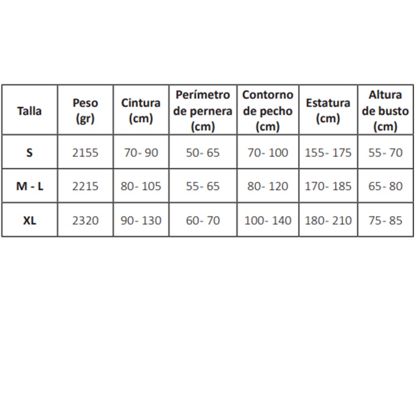 - Talla M-L: Cintura: 80-105 cm, pernera: 55-65 cm, pecho: 80-120 cm, estatura: 170-185 cm y altura de busto: 65-80 cm.