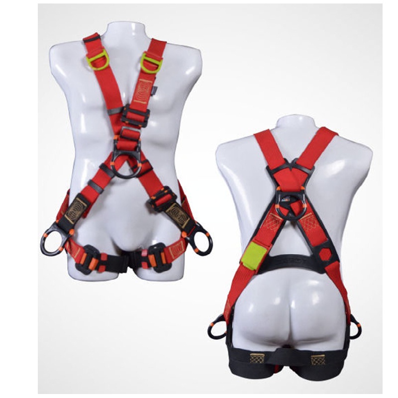 Arnés multipropósito de 4 puntos de anclaje en X, Fabricado en reatas de poliéster, con argollas de anclaje tipo “D”, hebillas metálicas y porta herramientas, especial para trabajo apoyado sobre las piernas.
