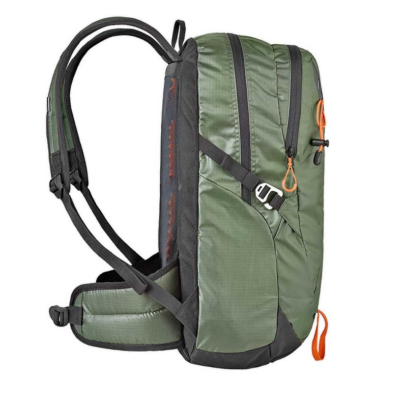 Fabricado con materiales resistentes a la abrasión y al uso prolongado, incluye espalda acolchada con canales de ventilación, correas anatómicas ajustables y cinturón lumbar con bolsillo incorporado. Además, ofrece acceso principal con doble cremallera, bolsillos laterales de malla, compartimento frontal elástico y funda interna para bolsa de hidratación.